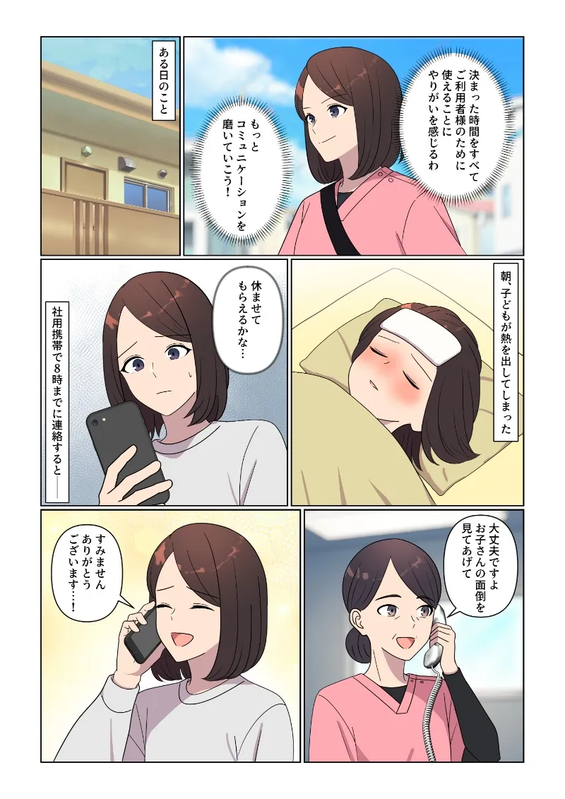 主人公「顔なじみの優しいご利用者様のおかげで、私は落ち着いてケアを実施でき、無事に終わったときにはホッとした」