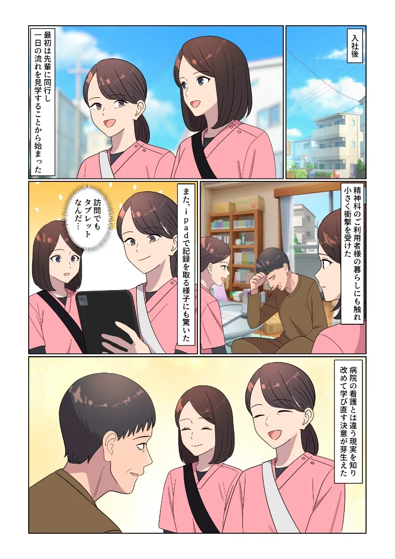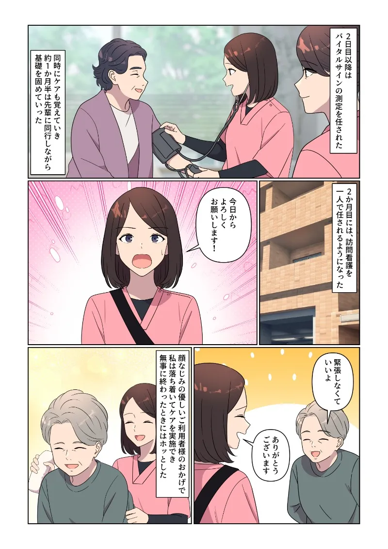 主人公「同時にケアも一緒に覚えていき、約1か月半は先輩に同行しながら基礎を固めていった」